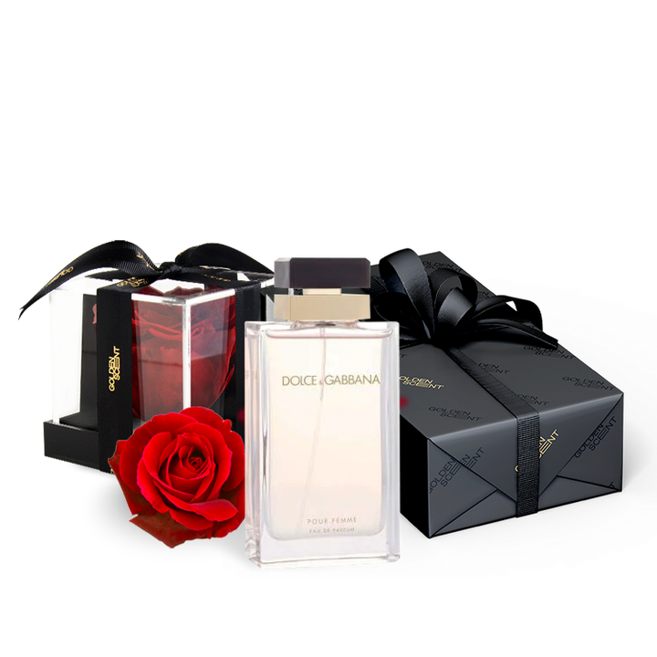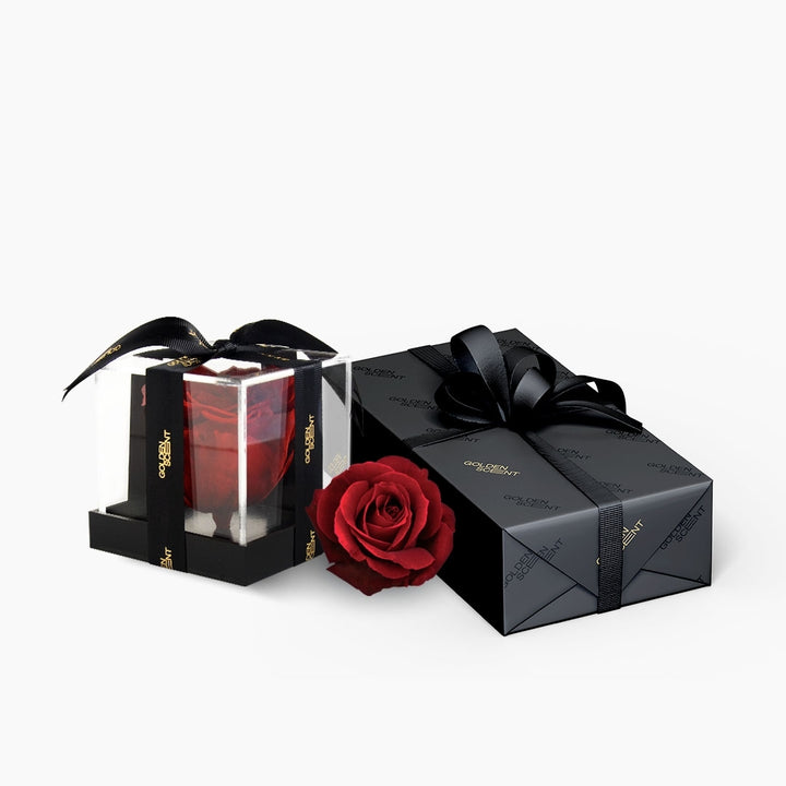امنح هديتك لمن تحب رونقاً مميزاً مع هذه الوردة الأبدية داخل صندوق أكريليك وتغليف للiدايا باللون الأسود.