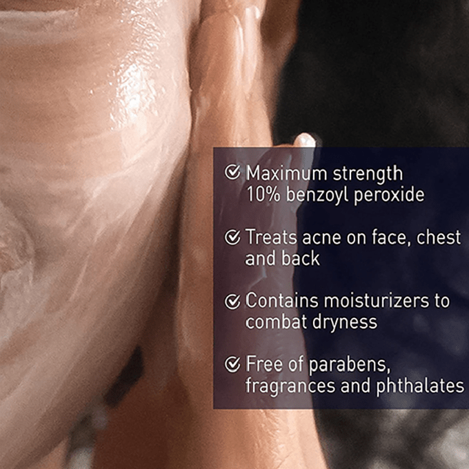 يحتوي على بيروكسيد البنزويل وهو مكون مضاد للبكتيريا لتحظى ببشرة صافية.