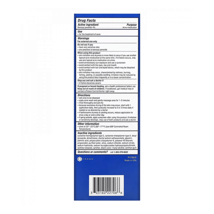 يحتوي هذا الغسول اليومي على 4% بنزويل بيروكسيد لإزالة حب الشباب بسرعة فائقة.