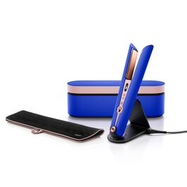 يأتي مُملّس الشعر دايسون كورالي™ بلون بلو بلاش مع حقيبة من تصميم دايسون وقاعدة ترافيل دوك™ القابلة للطي وحقيبة للسفر.